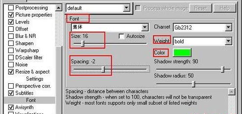 字幕方位,大小等,請根據(jù)我的設(shè)置來,設(shè)置成綠色,可以觀察壓片效果。這是我考察組員壓片效果的指標(biāo)之一,設(shè)置好的壓出來的rmvb,應(yīng)該是鮮綠色的,著實(shí)好看