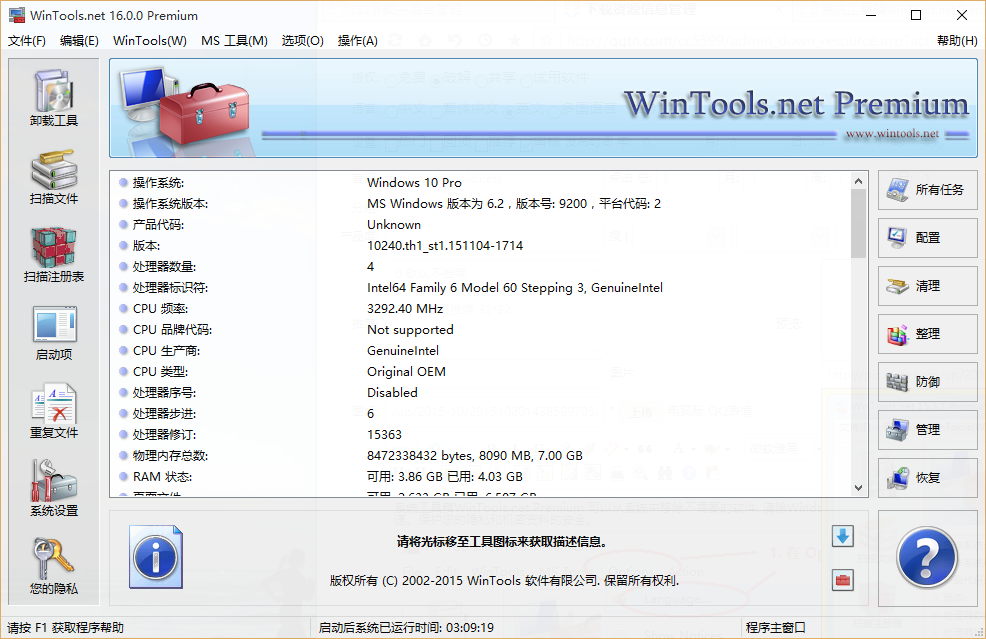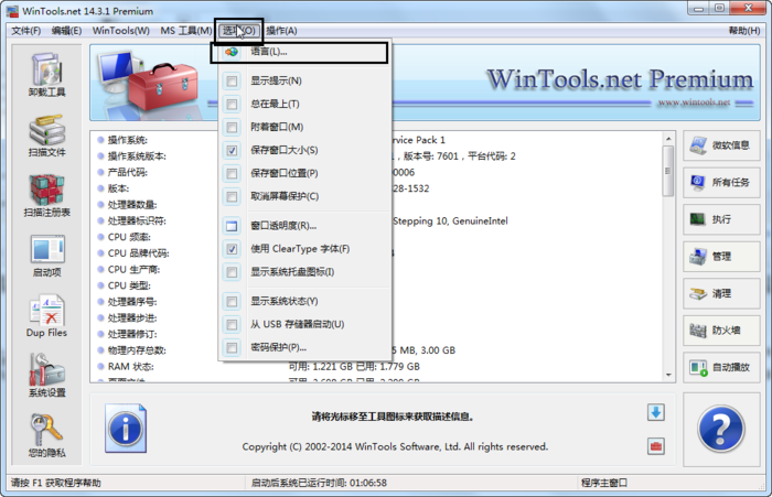 它還能使你的網(wǎng)絡(luò)連接更穩(wěn)定和快速。保護 您的隱私和機密資料的安全。WinTools.net Professional 包括工具:Clean Uninstaller(卸載器)、Scan Files(文件掃描器), Scan Registry(注冊表掃描器), Start Up(啟動管理), Tweak UI(系統(tǒng)設(shè)置), Net Tweaker(網(wǎng)絡(luò)設(shè)置), The Privacy(隱私策略)用于優(yōu)化 Microsoft Windows 操作系統(tǒng)的應用程序。通過清潔卸載工具 (Clean Uninstaller),本工具能夠清除硬盤中無用的軟件,跟蹤對硬件、MS Windows 注冊表和系統(tǒng)文件所做的更改。它還可通過掃描文件 (Scan File) 工具清除過時的參考和垃圾文件,以及位于桌面、開始菜單、應用程序數(shù)據(jù)和硬盤中的無效快捷方式。