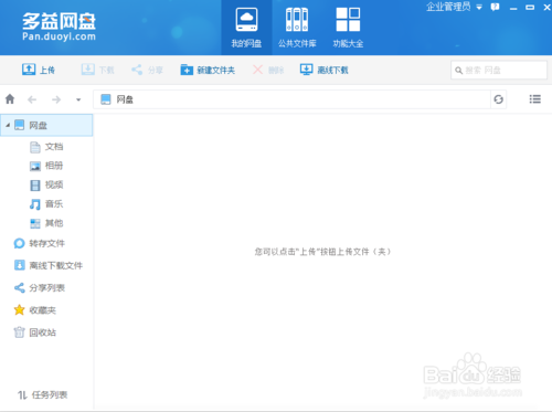 2、進(jìn)入后可以看到網(wǎng)盤(pán)界面如圖所示,你可點(diǎn)擊左上角的上傳按鈕進(jìn)行文件的操作。