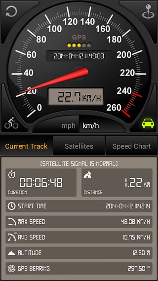 GPS儀表盤是一款不錯的GPS定位測速軟件。該軟件可記錄你每日出行的速度、距離、目的地耗費(fèi)時間等內(nèi)容,以便用戶可以了解自己每天的出行數(shù)據(jù)以及狀況。