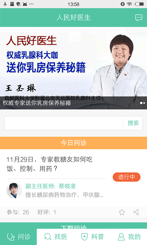 找醫(yī)生:人民好醫(yī)生問診團(tuán)隊(duì),成員為全國(guó)三甲醫(yī)院副主任醫(yī)師以上的知名醫(yī)生??蓪?duì)醫(yī)生進(jìn)行留言咨詢,定期回復(fù)。
