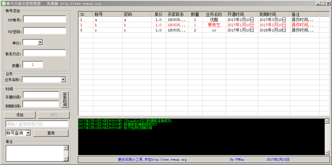 賬號出租出售管理器是一款小巧便捷的賬號出租或出售管理軟件。它的操作非常簡單方便,用戶只需要添加賬號寫好到期時間,到期當(dāng)日賬號就會被自動標(biāo)紅,超級簡單。