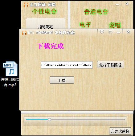 打開(kāi)軟件,可以點(diǎn)擊左側(cè)的“拒絕死宅”,“路上聽(tīng)的好”,“給你好心情”,“溫暖純音樂(lè)”,也可以點(diǎn)擊右側(cè)的普通電臺(tái)選項(xiàng)、年齡電臺(tái)選項(xiàng)有喜歡的曲目可以點(diǎn)擊“我要這首歌”后點(diǎn)擊下載,將會(huì)將歌曲下載到指定路徑