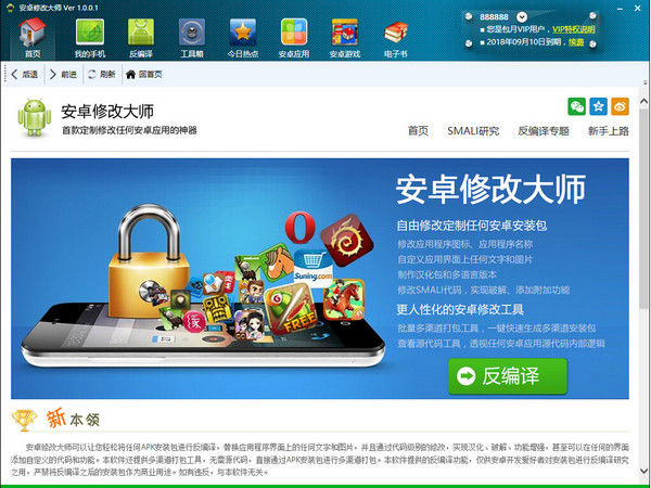 1、任意反編譯安卓應(yīng)用:自由定制任何沒有加固過的APK安裝包,可以修改應(yīng)用程序圖標(biāo)和應(yīng)用程序名稱、替換界面嗎上面的任何文字和圖片、翻譯或者漢化制作多語言版本,更支持通過高級的SMALI代碼,實現(xiàn)對應(yīng)用軟件的破解。2、擁有海量安卓應(yīng)用和游戲的模板,方便反編譯:提供海量最新最全的應(yīng)用作為定制模板,可以直接下載后進(jìn)行反向工程、破解、修改、查看源代碼、查看安裝包信息等操作(部分應(yīng)用由于做了加固,暫時不能進(jìn)行反向工程)。