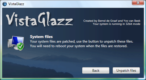 VistaGlazz V2.4 英文官方安裝版 VistaGlazz 是一個用來修補(bǔ)Windows Vista系統(tǒng)文件的小型程序,它可以讓你使用第三方的風(fēng)格和主題,它同樣包括Aero透明風(fēng)格,在32/64位系統(tǒng)下均有效