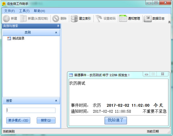 莊生曉工作助手是一款面向企業(yè)和個(gè)人用戶的免費(fèi)軟件,莊生曉工作助手有兩大功能:資料管理和通知管理。資料管理是對(duì)資料進(jìn)行分門別類管理和檢索,支持中文全文檢索和自定義關(guān)鍵詞檢索。通知管理是將重要事情通知到用戶。【軟件特點(diǎn)】