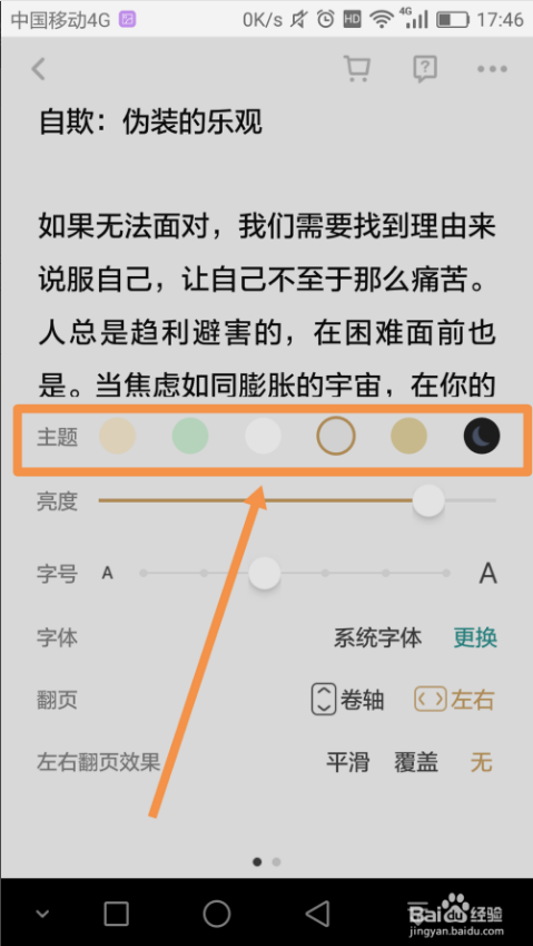 彈出網(wǎng)易蝸牛讀書的閱讀設置功能欄,然后找到【主題】功能欄,一共有六種主題色可選,如圖: