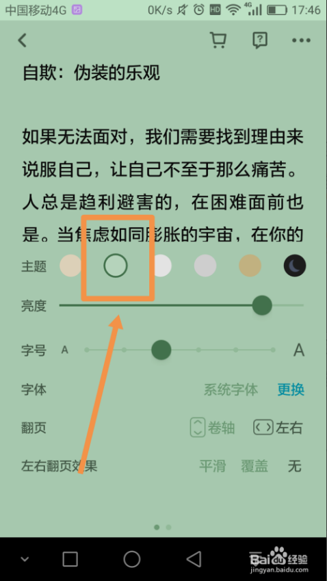 例如:選擇其中的綠色,網(wǎng)易蝸牛讀書的閱讀主題就變成綠色的了,如圖: