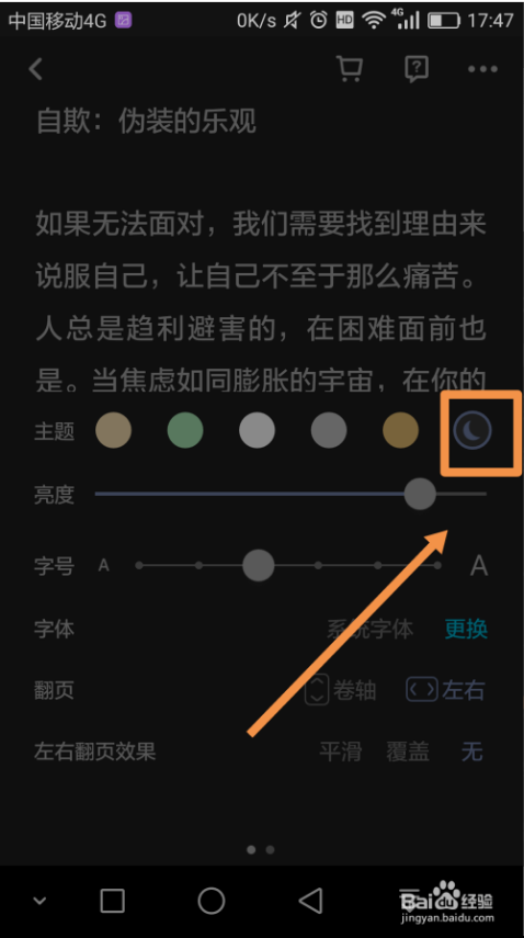 然后選擇最后一個主題色:夜晚模式,網(wǎng)易蝸牛讀書的閱讀主題就變成黑色的了,如圖: