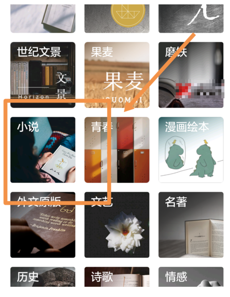 進入網(wǎng)易蝸牛讀書的【分類】界面,選擇書籍的分類,例如:【小說】并點擊,如圖: