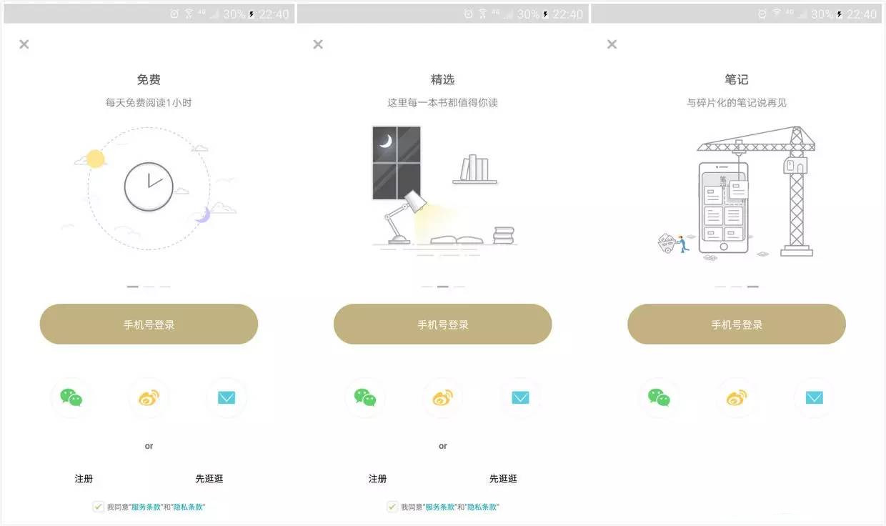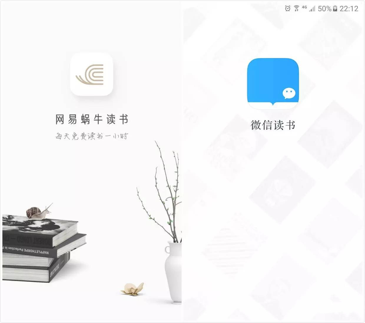 針對啟動頁背景上,孰高孰低不好說,蝸牛讀書營造的是安心的讀書環(huán)境,微信讀書傳達給用戶的是海量的書庫。但蝸牛讀書將主打的每天免費讀書一小時的slogan寫在了啟動頁上,能讓用戶直觀理解蝸牛讀書的閱讀模式。