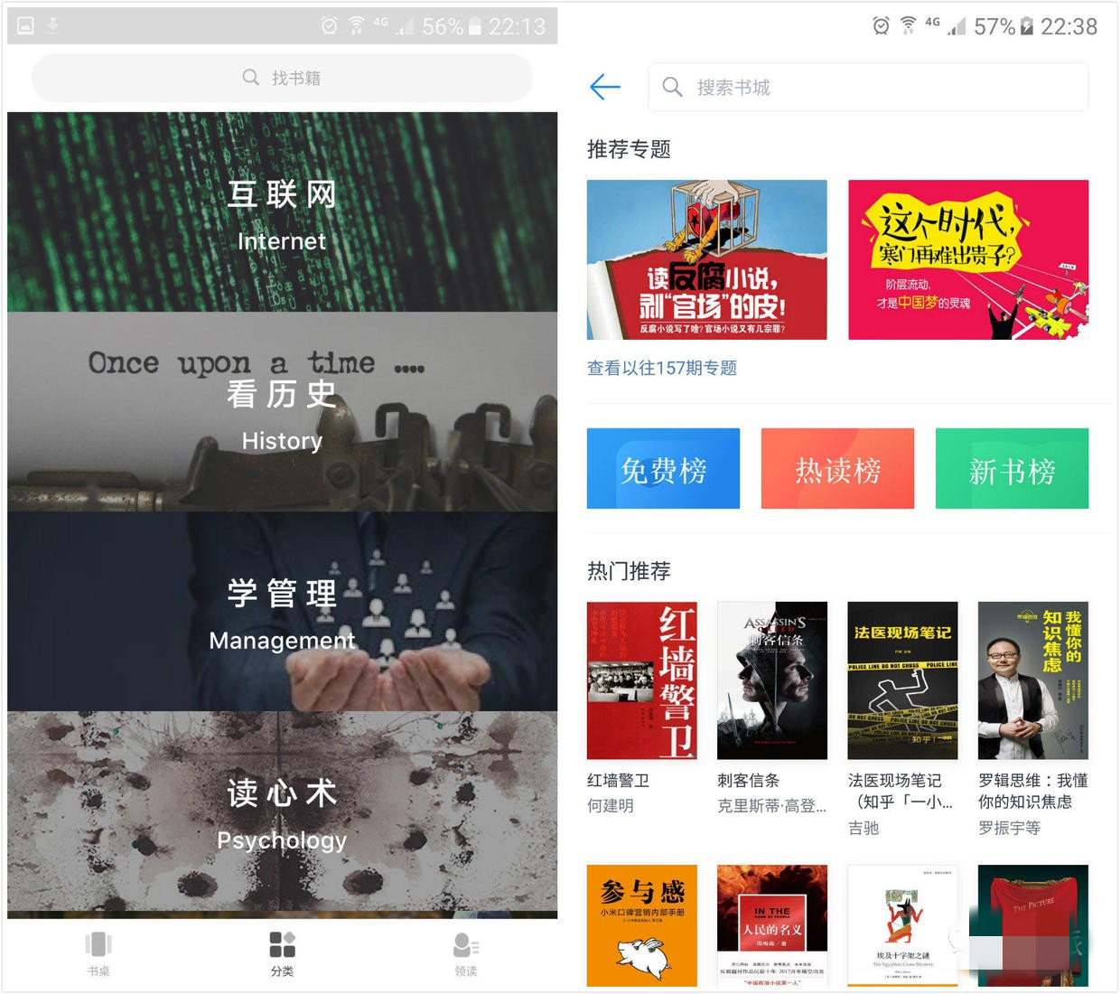 在閱讀前,為用戶選擇圖書提供分類、搜索、以及領讀人推薦三種方式,有針對性的為用戶提供書籍選擇方式,對于漫無目的的休閑類閱讀者,可以通過查看喜好的分類和領讀人動態(tài)來選擇書籍,對于明確閱讀目標的閱讀者來說,可通過搜索查找得到自己想要閱讀的書籍。