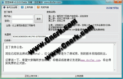 豆豆快傳是一款豆丁網(wǎng)批量上傳軟件,用于可以在不打開(kāi)IE的情況下批量上傳自己的文檔(包括任何官方許可的格式),同時(shí)能夠?yàn)閱蝹€(gè)上傳文檔設(shè)置文檔的價(jià)格、分類(lèi)、標(biāo)簽、簡(jiǎn)介等。上傳速度快,占用資源小,可長(zhǎng)期運(yùn)行。