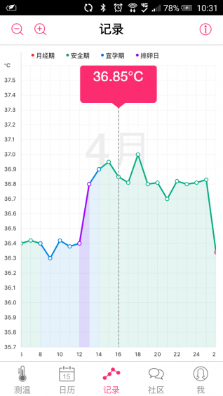 2、自動(dòng)繪制基礎(chǔ)體溫曲線(xiàn)圖并標(biāo)注排卵日、經(jīng)期等。