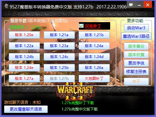 9527魔獸版本轉(zhuǎn)換器1.20e-1.27b 免費(fèi)中文版是一款支持1.27B的2017年最新魔獸爭霸版本轉(zhuǎn)換器,支持多達(dá)14個魔獸版本,而軟件包大小僅僅17MB,功能強(qiáng)大,簡單易用。