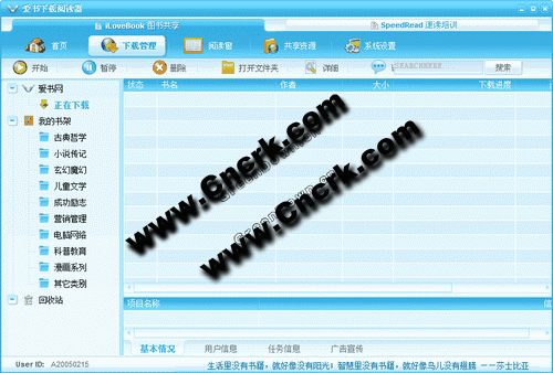 愛書下載閱讀器 V2.2 簡體中文綠色免費(fèi)版 愛書下載閱讀器是一款專業(yè)的P2P軟件,可搜索網(wǎng)絡(luò)種子資源并下載。軟件采用標(biāo)準(zhǔn)的官方BT協(xié)議,并提供最新技術(shù)的DHT網(wǎng)絡(luò)支持,具有無Tracker種子服務(wù)器狀態(tài)下的搜索下載功能。