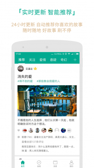 智能推薦引擎,自動識別你的興趣,24小時滾動更新好故事;