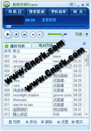 聆聽環(huán)球播放 V1.0 簡體中文官方安裝版 聆聽player默認的列表是網(wǎng)絡(luò)上珍藏的環(huán)球精品典藏音樂,絕對好聽的精品,希望經(jīng)常更新默認曲庫里面的歌曲,我們會不定期更新,給你煥然一新的音樂試聽體驗。還支持本地歌曲的播放,還有收聽廣播電臺的功能