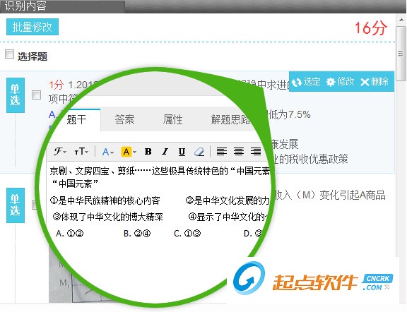 智能識別切割題題目、答案,支持調(diào)整試題類型、答案、分值、解題思路……自動分析試題情況并生成報告,提供一鍵修復(fù)功能,輕松完成試卷的導(dǎo)入、調(diào)整等工作。