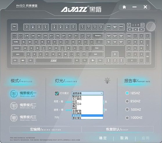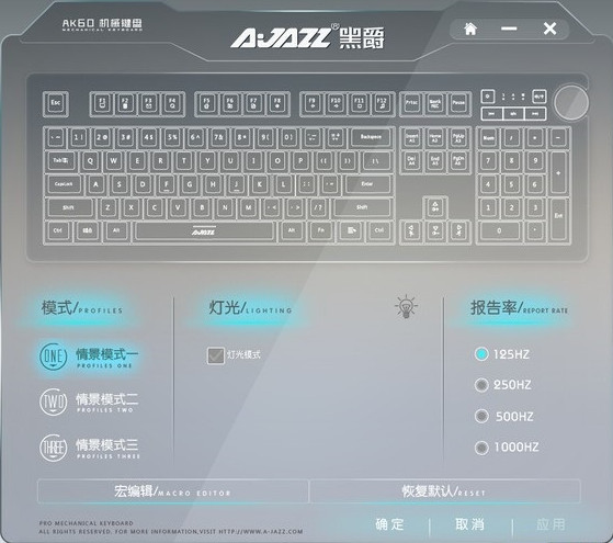 在驅(qū)動程序的默認界面,玩家可以調(diào)節(jié)鍵盤的報告率,切換情景模式,也就是鍵盤不同的配置,另外還可對燈光及宏按鍵進行編輯。