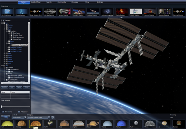 這次的更新軟件界面并未有重大更新,功能方面有較多改進:改進的帶關鍵幀編輯功能的動畫和過渡控件、新的 MIDI 控制器支持、管理投影儀節(jié)點/檢查狀態(tài)/渲染性能、支持 WMS 時間序列圖像、新的大氣和光線陰影渲染提高真實度、太陽系模式下的旋轉(zhuǎn)和傾斜視角、高細節(jié) ISS 和 Gemini 觀測臺模型、支持地球表面和天空層的數(shù)據(jù)可視化。