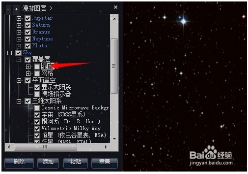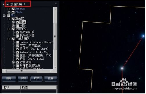 在屏幕的左側,可以看到“漫游圖層”。漫游圖層就是主窗口中需要顯示的東西。比如星座的連線。