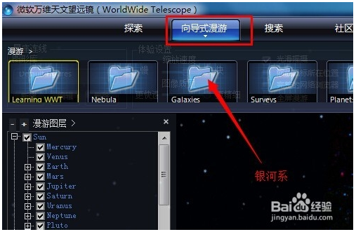 向?qū)铰危?br />點擊主菜單中的向?qū)铰?,選擇一個星系,這里以銀河系(galaxy)為例。