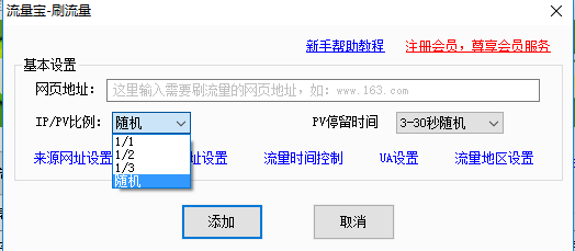 二、在出現(xiàn)的框中可以進(jìn)行設(shè)置。輸入要刷流量的網(wǎng)址,可以設(shè)置IP/PV的比例、PV停留時間等信息,設(shè)置完畢點擊【添加】。
