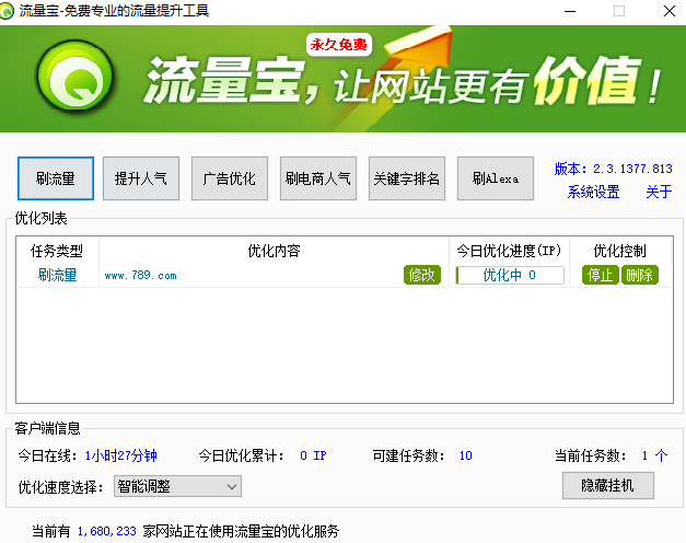 1、綠色免費(fèi):流量寶是一款綠色軟件,無需注冊。只需下載到桌面上直接運(yùn)行,永久免費(fèi)。2、操作簡單:運(yùn)行軟件,輸入要優(yōu)化的網(wǎng)址,點開始優(yōu)化即可。