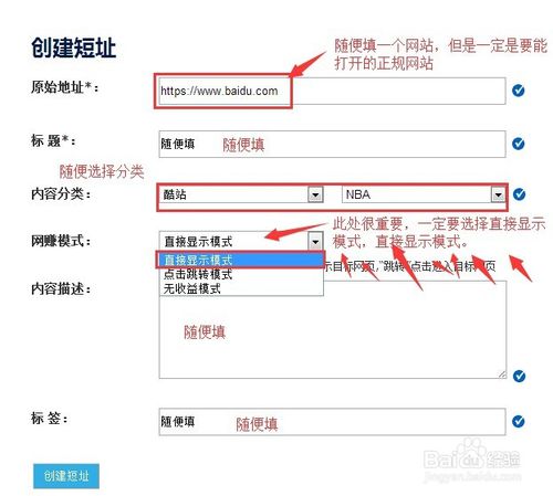 3.點擊創(chuàng)建短址之后,進(jìn)入短址創(chuàng)建頁面,如圖。此處比較重要的一點,在選擇網(wǎng)賺模式的時候一定、必須選擇直接顯示模式,直接顯示模式,直接顯示模式,重要的事要說三遍。如果不選擇這個的話是不行的。參照例圖填寫創(chuàng)建頁面信息,之后點擊創(chuàng)建