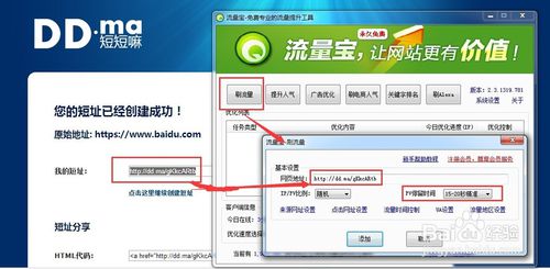6.雙擊一下在到電腦的流量寶軟件,點擊軟件上的刷流量,將第四步中在短短嘛復(fù)制留存下來的網(wǎng)址復(fù)制到彈出的框中的網(wǎng)址地址中,PV停留時間選擇15-20秒精準(zhǔn),點擊添加即可。這樣這個任務(wù)就算完成了。流量寶允許同時執(zhí)行15個任務(wù),可依照第三步至第六步的方法做15個任務(wù)。