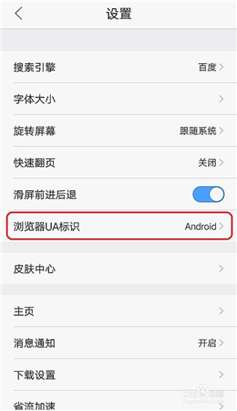 在設(shè)置中找到“瀏覽器UA標(biāo)識(shí)”,點(diǎn)擊并打開;