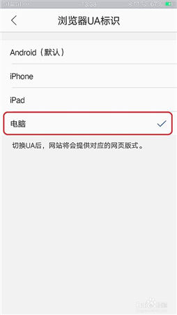 在瀏覽器UA標(biāo)識(shí)界面,選擇“電腦”,手機(jī)QQ瀏覽器的瀏覽模式就成為電腦版了。