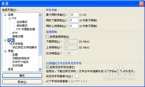 3、下載加速秘籍:使用Filezilla軟件下載FTP文件,默認只開啟了兩個線程,在傳輸?shù)年犃兄幸部梢钥吹?,只有兩個文件在同時下載。我們可以設置使用10個線程同時下載,設置方法如下:菜單編輯==》設置,彈出如下畫面,點擊左邊"傳輸",設置“最大同時傳輸”為10,點擊“確定”保存設置。下載速度馬上就飚升起來了。