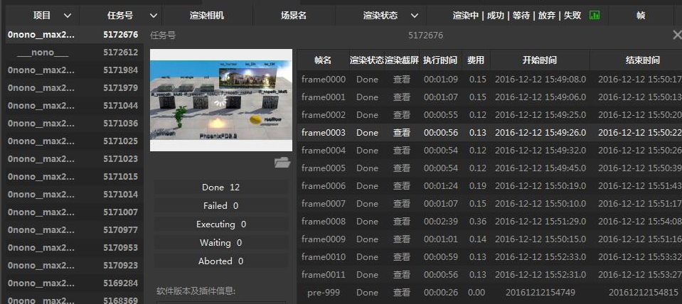 系統(tǒng)自動完成分析、渲染,進度條可以查看渲染進度,渲染過程中可以右鍵>顯示詳細幀,能查看每一幀的渲染時間和費用