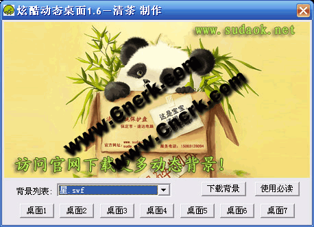 軟件界面上有五個桌面按鈕,可以快速設置喜歡的動態(tài)桌面背景。您還可以去網上任意下載自己喜歡的flash動畫設為動態(tài)背景,快去試試看吧!