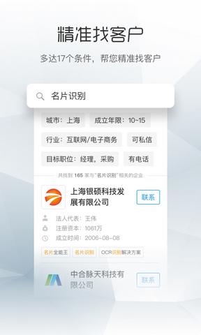 【查企業(yè)】 查詢企業(yè)介紹、工商信息、主營業(yè)務(wù)、產(chǎn)品服務(wù)詳情、聯(lián)系郵箱、對外電話、商標、專利、招投標、招聘職位等100余項深度信息【找客戶】 使用多達17個維度精準篩選企業(yè)列表,找客戶,找人脈和合作伙伴