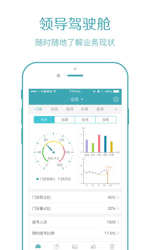 (1)領(lǐng)導(dǎo)駕駛艙,包括門診、住院、醫(yī)技、藥品及醫(yī)保五大主題,每一主題均由關(guān)鍵數(shù)據(jù)形成的圖表及KPI指標(biāo)列表構(gòu)成;