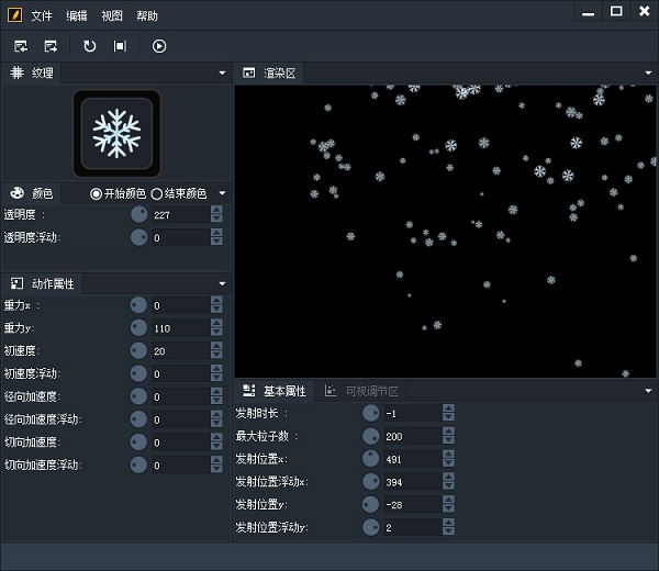 顏色面板分為兩部分,開始顏色和結(jié)束顏色,一個(gè)粒子開始到結(jié)束,顏色也會(huì)發(fā)生過渡變化,目前引擎支持透明度,所以這里就不開放RGB顏色的設(shè)置啦。