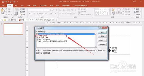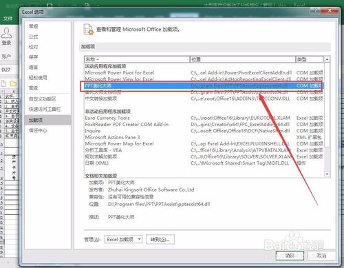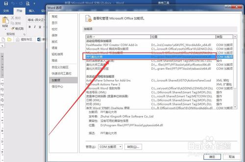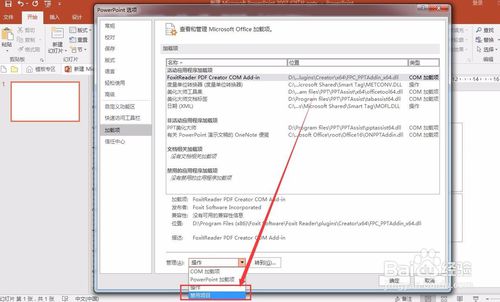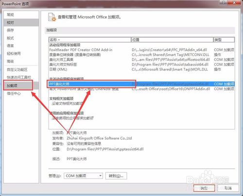 在最下方的“管理”中選擇COM加載項(xiàng),并點(diǎn)擊右側(cè)的“轉(zhuǎn)到”。在彈出的“可用加載項(xiàng)”對話框中勾選PPT美化大師并點(diǎn)擊確定。