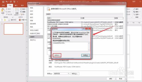 如果上述步驟無效,按照第3步步驟,在“管理”中選擇“禁用項(xiàng)目”,并點(diǎn)擊“轉(zhuǎn)到”。在彈出的“禁用項(xiàng)目”中如果有PPT美化大師則點(diǎn)擊“啟用”即可。