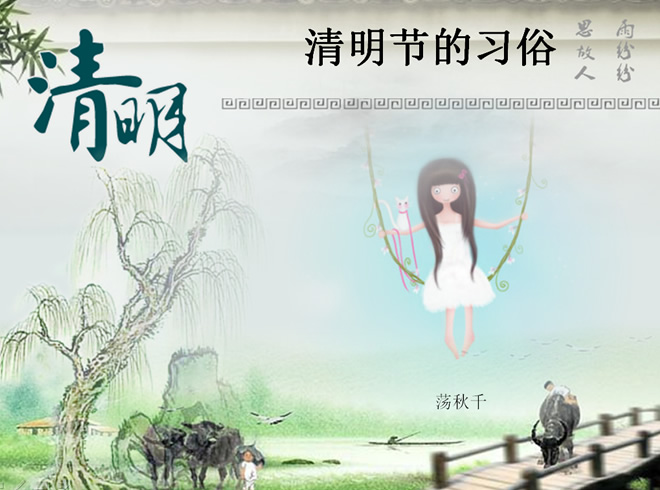 清明節(jié)ppt課件是一個關(guān)于清明節(jié)的中國風(fēng)PPT模板,詳細(xì)的介紹了清明節(jié)的來源,清明節(jié)的典故、清明節(jié)的詩詞、清明節(jié)的傳說等等內(nèi)容,以及插柳、蕩秋千、踏青等傳統(tǒng)習(xí)俗活動,可以用來作為教學(xué)課件使用。