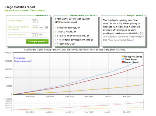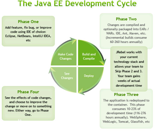 JRebel是一款JAVA虛擬機(jī)插件,它使得JAVA程序員能在不進(jìn)行重部署的情況下,即時(shí)看到代碼的改變對(duì)一個(gè)應(yīng)用程序帶來(lái)的影響。JRebel使你能即時(shí)分別看到代碼、類和資源的變化,你可以一個(gè)個(gè)地上傳而不是一次性全部部署。當(dāng)程序員在開(kāi)發(fā)環(huán)境中對(duì)任何一個(gè)類或者資源作出修改的時(shí)候,這個(gè)變化會(huì)直接反應(yīng)在部署好的應(yīng)用程序上,從而跳過(guò)了構(gòu)建和部署的過(guò)程,每年可以省去部署用的時(shí)間花費(fèi)高達(dá)5.25個(gè)星期。