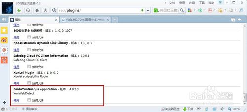 在插件管理頁面中,找到BaiduYunGuanjia Application 插件,勾選“始終允許”,并點擊“停用”使狀態(tài)變?yōu)椤耙淹S谩薄?br />