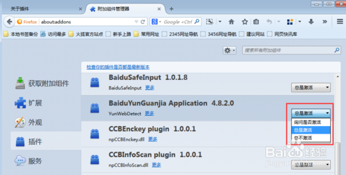 在火狐瀏覽器地址欄輸入about:addons,找到BaiduYunGuanjia Application 插件,激活即可。