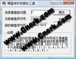 硬盤序列號(hào)修改器可以修改磁盤分區(qū)的序列號(hào)。硬盤序列號(hào)修改器修改的是硬盤邏輯序列號(hào)而不是硬盤物理序列號(hào)!修改后需要重新啟動(dòng)機(jī)器使更改生效。硬盤序列號(hào)的格式是 xxxx-xxxx(x 為十六進(jìn)制數(shù),可以是0、1、2、3、4、5、6、7、8、9、a、b、c、d、e、f)。