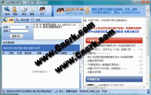 特別說(shuō)明:本軟件為QQ天下網(wǎng)(qq2012cn.com)配套軟件客戶端,非群發(fā)類軟件,本軟件也可替代QQ客戶端,以使信息更方便整理匯總。