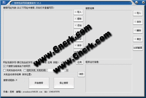 悠樹(shù)電話號(hào)碼搜索軟件支持指定網(wǎng)站·網(wǎng)址列表導(dǎo)入搜索和搜索引擎多關(guān)鍵字同時(shí)搜索,6個(gè)常用搜索引擎任意選擇,是一款實(shí)用的電話號(hào)碼高速搜索軟件。