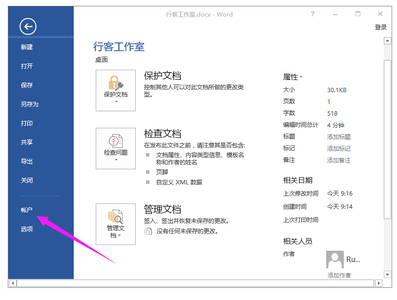 3、怎么檢測(cè)Office2016是否激活了,如下圖所示,隨便打開(kāi)一個(gè)word或者excel然后點(diǎn)擊左上角的【文件】菜單,然后點(diǎn)擊開(kāi)【賬戶】,就可以看到office是否激活了。
