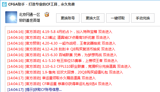 cfga助手,穿越火線最新活動一鍵領(lǐng)道具工具官方網(wǎng)站,打造專業(yè)的CF活動工具。主要功能一鍵領(lǐng)活動道具、活動列表、戰(zhàn)績查詢、CDK兌換等功能。永久免費使用!
